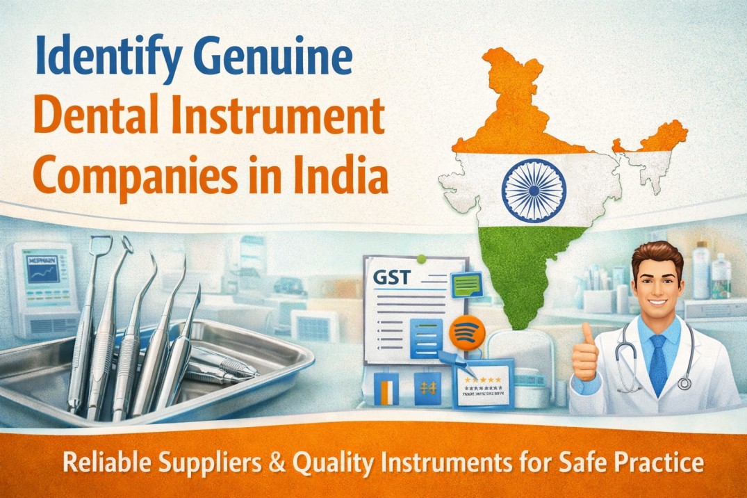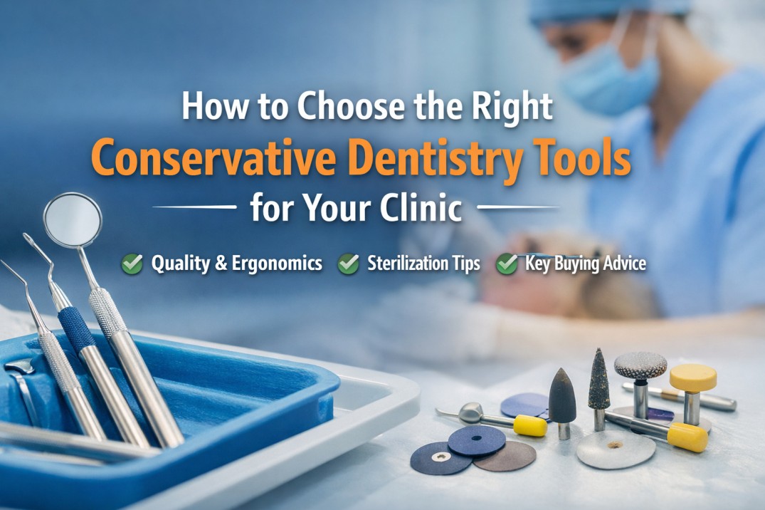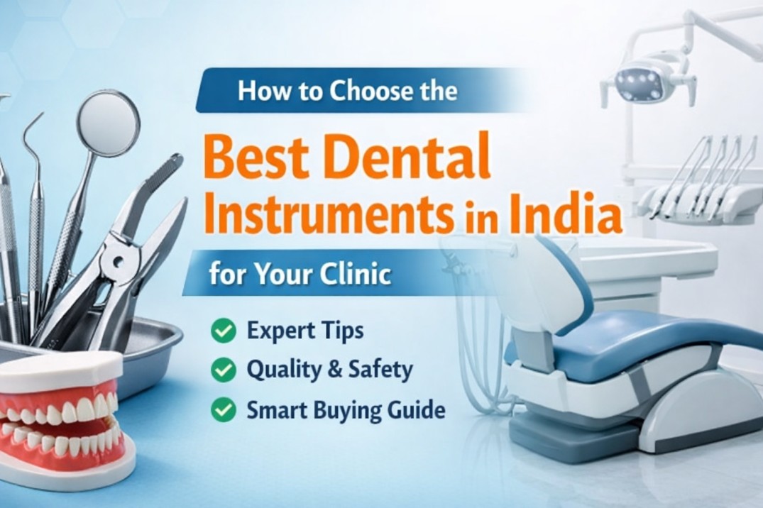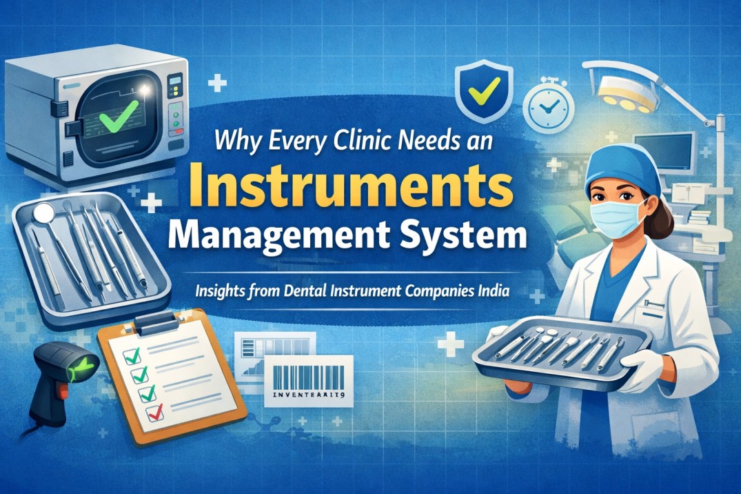 This banner is designed to be clean and professional, particularly for promoting an instruments management system for clinics. It features organized dental tools, images of sterilization and efficiency, and a healthcare worker with instruments. The portrayal of safety and precision, as well as modern clinical practices, makes it suitable for blogs aimed at improving workflow, hygiene, and patient care.